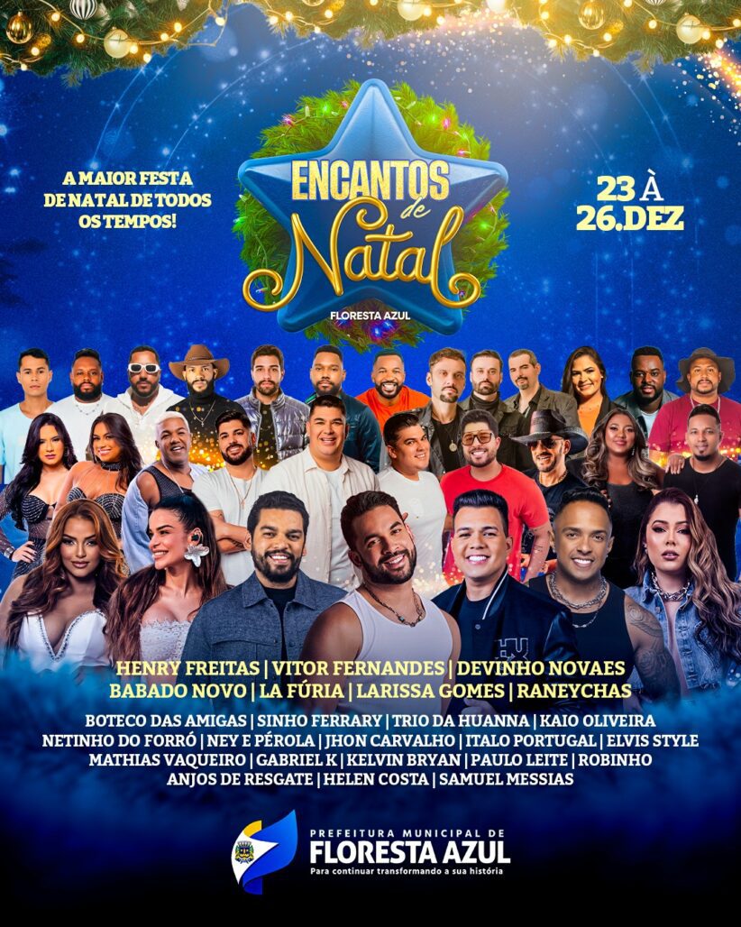 Floresta Azul se prepara para viver um momento histórico com a realização do Encantos de Natal, considerado o maior evento natalino já promovido no município. De 23 a 26 de dezembro, a cidade será palco de uma programação especial que une cultura, música, entretenimento e o verdadeiro espírito natalino, atraindo moradores, visitantes e turistas de toda a região.
