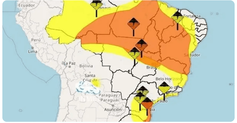 O Inmet alerta para chuvas entre 30 e 60 mm/h ou 50 e 100 mm por dia e ventos intensos de 60 a 100 km/h. É destacado o risco de corte de energia elétrica, queda de galhos de árvores, alagamentos e de descargas elétricas.