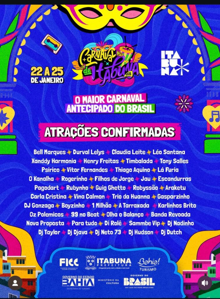 O Carnaval Antecipado de Itabuna já tem programação oficial definida e promete movimentar a cidade entre a próxima quinta-feira (22) e o domingo (25), no Circuito Sabará, na Avenida Aziz Maron. O evento reúne atrações nacionais e regionais, distribuídas ao longo de quatro dias de festa, com ordem de apresentação já estabelecida.
