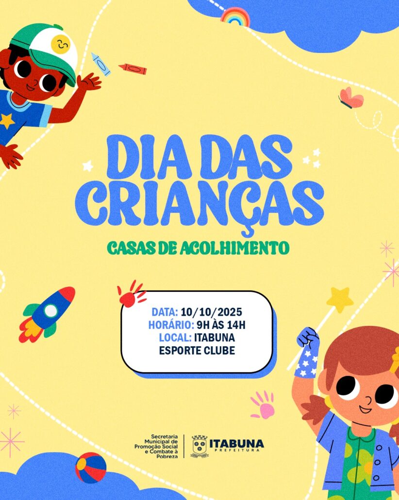 A Prefeitura de Itabuna, por intermédio do Departamento de Proteção Especial de Alta Complexidade da Secretaria de Promoção Social e Combate à Pobreza (SEMPS), promove nesta sexta-feira, dia 10, das 9 às 14 horas, na sede social do Itabuna Esporte Clube, a comemoração antecipada do Dia das Crianças.
