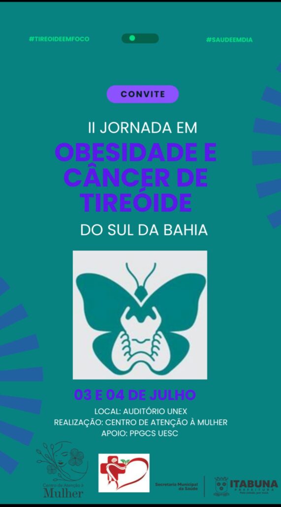 A Prefeitura de Itabuna, por meio do Centro de Atenção à Mulher Mariana Domingas Santos (CAM Itabuna), da Secretaria Municipal de Saúde, realizará nesta quinta e sexta-feira, dias 3 e 4, no auditório da UNEX, a II Jornada em Obesidade e Câncer de Tireoide do Sul da Bahia.