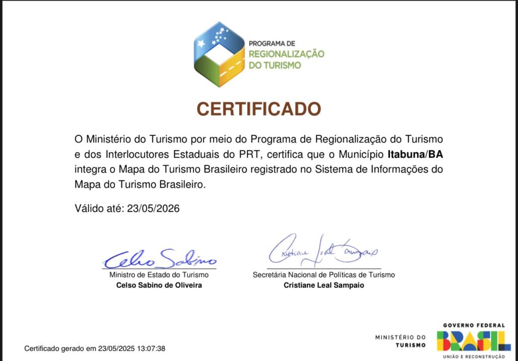 Após seis anos fora do Mapa do Turismo, Itabuna retornou ao programa e recebeu nesta sexta-feira, dia, a sua Certificação de inclusão nas Regiões Turísticas do Mapa Brasileiro compondo a Região Turística da Costa do Cacau.