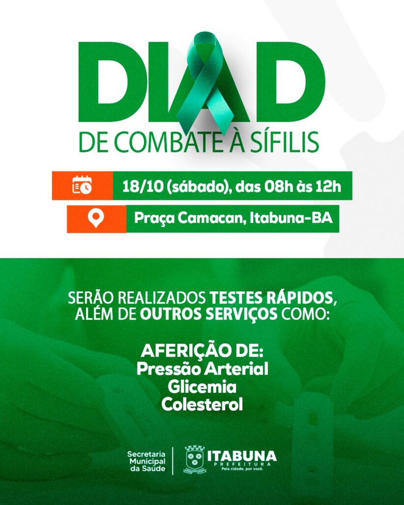 A Prefeitura de Itabuna, por meio do Centro de Referência em Prevenção, Assistência e Tratamento (CERPAT) da Secretaria Municipal de Saúde, realizará neste sábado, dia 18, o dia “D” de Combate à Sífilis, como parte das ações da Campanha Outubro Verde. A data é organizada pelo Ministério da Saúde, com o objetivo de intensificar as ações de conscientização, prevenção e o diagnóstico da doença sexualmente transmissível.